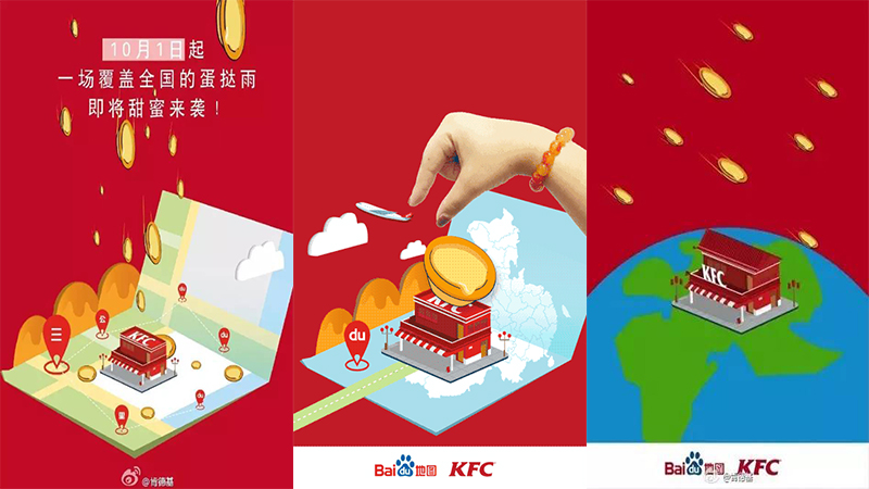 国庆长假前夕,基于百度地图的强大定位功能,肯德基宣布与百度地图携手,推出O2O出行新模式。9月28日起,肯德基将全国4800家线下门店接入百度地图平台,打造全景的“肯德基虚拟餐厅”。同时,肯德基还在这4800多家餐厅备足了100万枚葡式蛋挞,期待与餐厅周边3公里内的消费者甜蜜“偶遇”。
