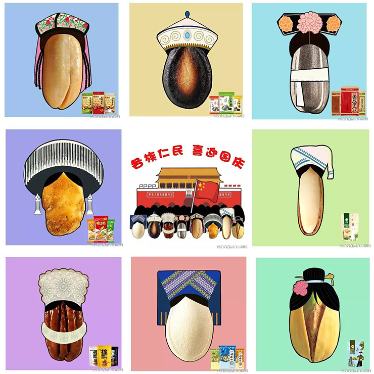 洽洽将各族人民服饰特色和各类食品结合,既带入了产品,又没有流于大众。是国庆众多海报中比较有创意的。