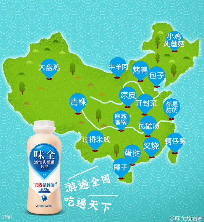 据说有90%的吃货,是根据这张图决定长假去哪儿旅游的,所以说味全这则海报真的是很体贴了,完全抓住吃货的旅行心理,去哪儿玩不重要,重要的是吃什么!