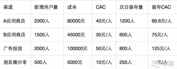 本来A应用商店的CAC是高于B应用商店。但是结合留存用户看,A应用商店的实际CAC低于B应用商店。因为不同渠道的用户质量不一样,A应用商店的用户显然更贴合产品,虽然贵了些,但实际上它更好。